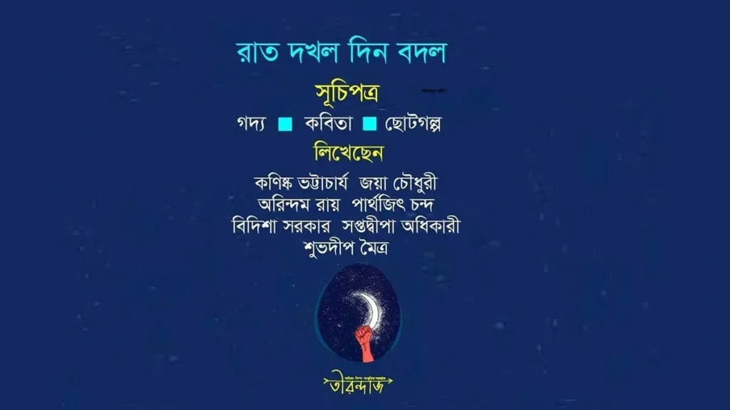 প্রিয় পাঠক, আমাদের এই ভূখণ্ডে ‘জুলাই আন্দোলনে’র কিছুদিন পরেই সীমান্তের ওপারে শুরু হয় ‘রাত দখল’-এর আন্দোলন। জুলাই আন্দোলন নিয়ে তীরন্দাজ একটি বিশেষ সংখ্যা করেছে। এরপর ইচ্ছে ছিল ‘রাত দখল’ নিয়ে একটা বিশেষ সংখ্যা করবার। সেইভাবে লেখকদের সঙ্গে যোগাযোগ করেছিলাম। তারা লেখাও দিলেন, অনেকের কাছ থেকে লেখা পাওয়ার প্রতিশ্রুতিও পেলাম। কিন্তু এর মাঝে হঠাৎ করে তীরন্দাজ-এর ওয়েব সাইটটিতে প্রযুক্তিগত সমস্যা দেখা দিল। থমকে গেল প্রকাশনার কাজ। অবশেষে সেই সমস্যা কাটিয়ে সংখ্যাটি লেখকদের সামনে হাজির করতে পেরে আমরা আনন্দিত। সময় মতো প্রকাশের প্রতিশ্রুতি আমরা রক্ষা করতে পারিনি বলে সীমান্তের ওপারের লেখক বন্ধুদের কাছে দুঃখপ্রকাশ করছি। সংখ্যাটি কেমন লাগল, আমাদের জানাতে ভুলবেন না। চিঠি লেখার ইমেইল অ্যাড্রেস : eteerandaz@gmail.com